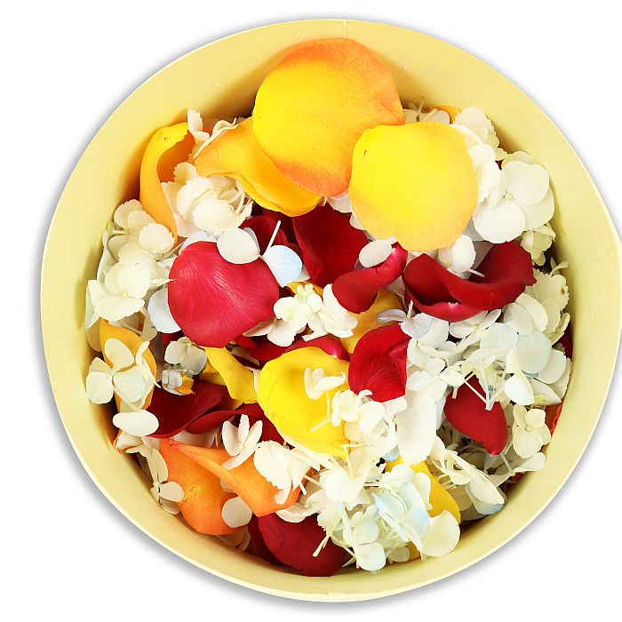 Our vibrant bouquet is a breathtaking expression of nature's finest offerings. Carefully composed with a mix of Hydrangea petals, Rose petals, and Chrysanthemum petals, this floral arrangement is designed to captivate with its lively hues and sophisticated style.